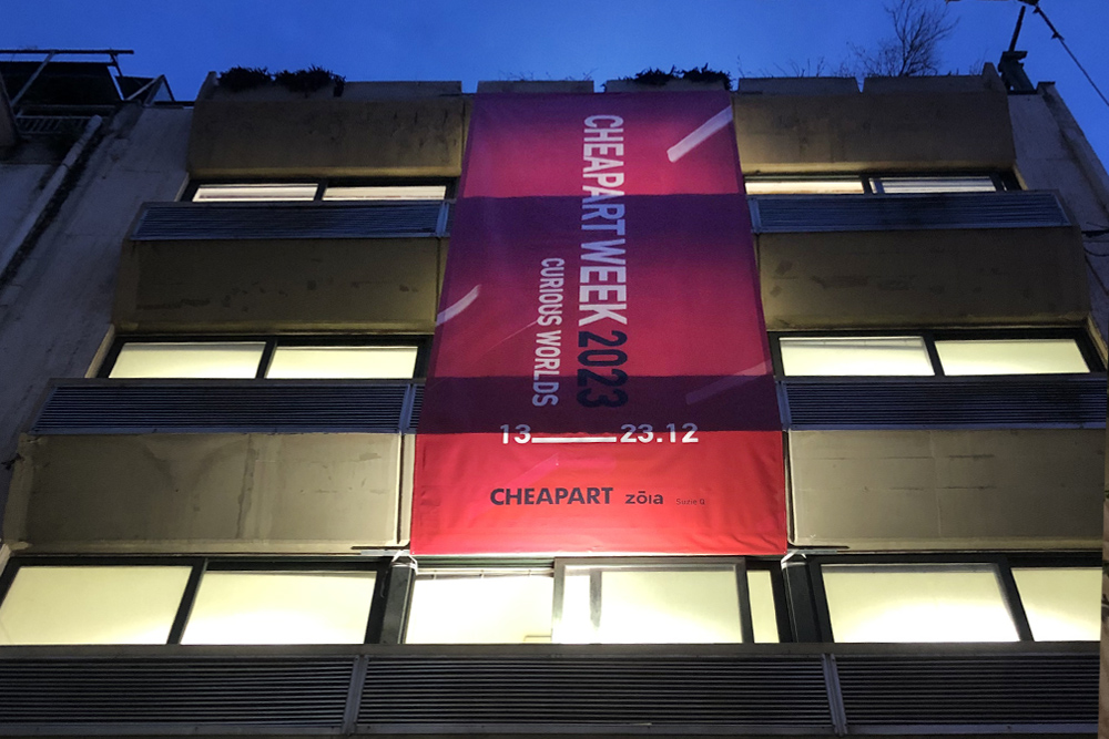 CHEAPARTWEEK2023: Curious worlds σας προσκαλεί στην περιπέτεια της τέχνης, σε ένα παιχνίδι περιέργειας και ανακάλυψης, γνωριμιών και ανταλλαγής απόψεων. Από τις 13 – 23 Δεκεμβρίου το Αθηναϊκό κοινό θα υποδεχθούν 86 καλλιτέχνες ─ 9 επιμελητές ─ 35 performance artists με εικαστικές προτάσεις, περφόρμανς, προβολές και παρουσιάσεις στους 7 ορόφους στο νέο κτίριο της CHEAPART, Ζωοδόχου Πηγής 66, στην καρδιά των Εξαρχείων.